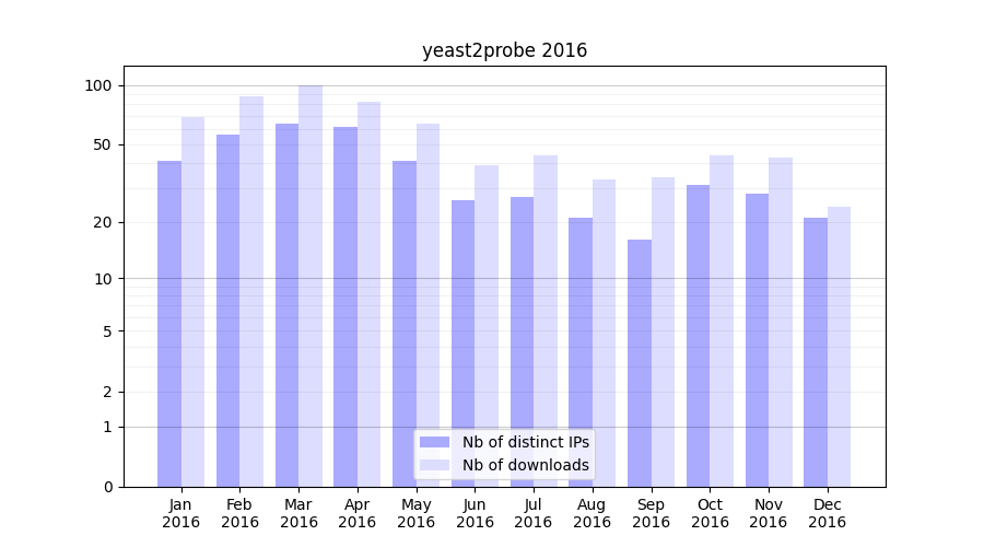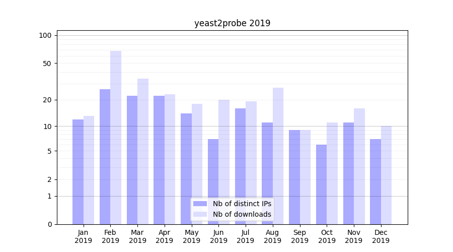Number of downloads for annotation package yeast2probe, year by year, from 2025 back to 2014 (years with no downloads are omitted):