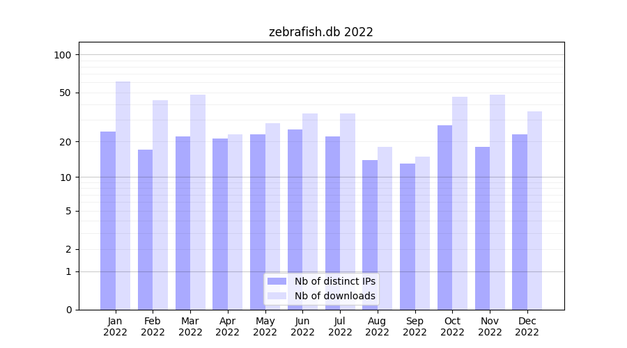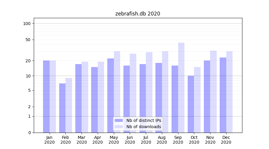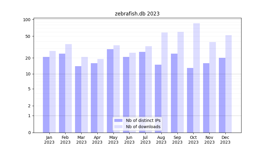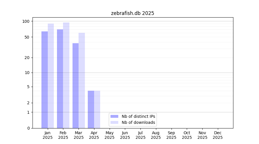 Number of downloads for annotation package zebrafish.db, year by year, from 2025 back to 2014 (years with no downloads are omitted):