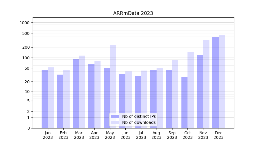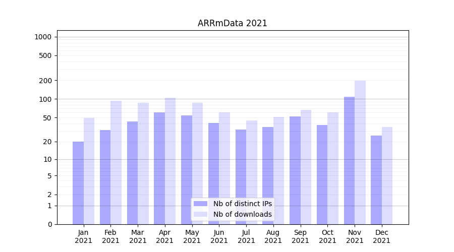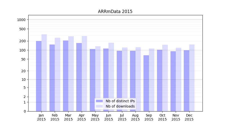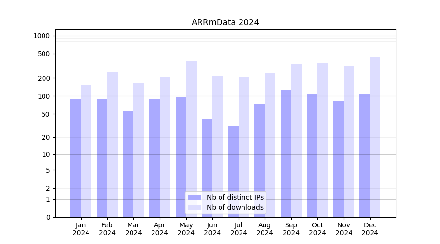 Number of downloads for experiment package ARRmData, year by year, from 2025 back to 2014 (years with no downloads are omitted):