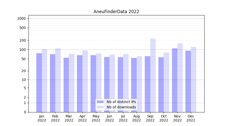 Number of downloads for experiment package AneuFinderData, year by year, from 2025 back to 2014 (years with no downloads are omitted):