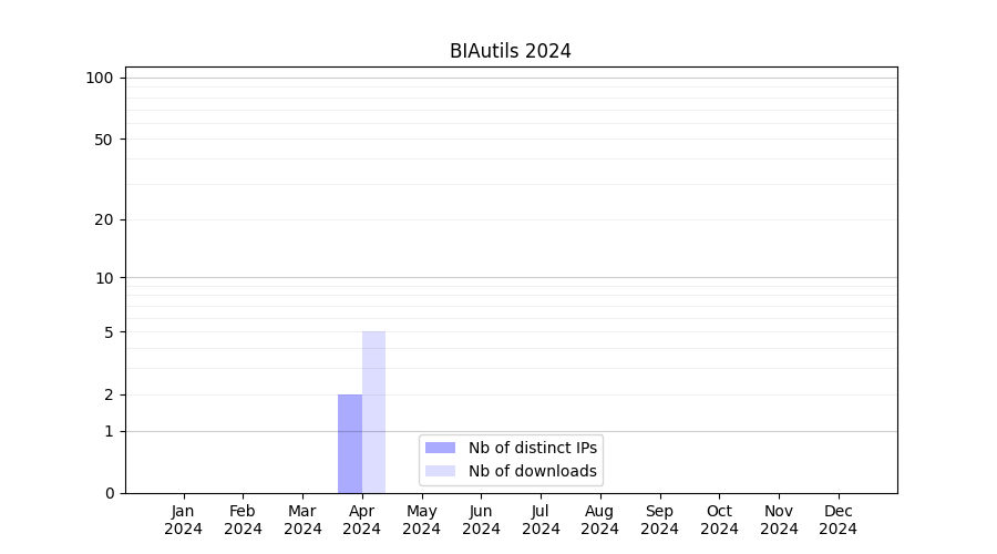 Number of downloads for experiment package BIAutils, year by year, from 2025 back to 2014 (years with no downloads are omitted):
