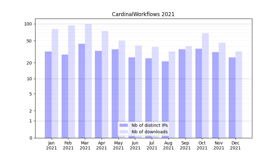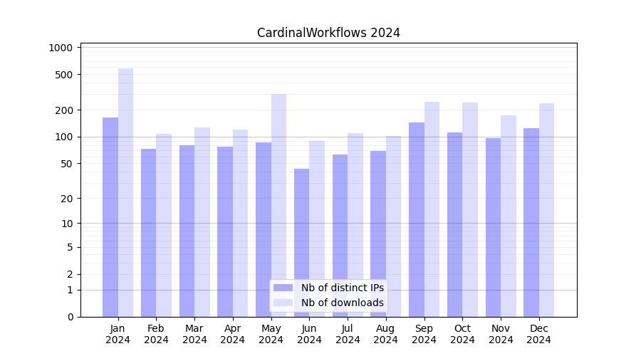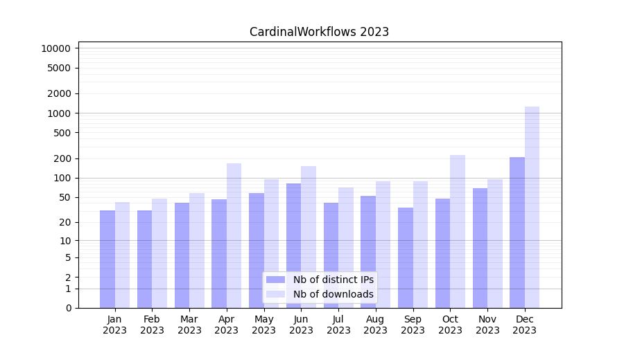 Number of downloads for experiment package CardinalWorkflows, year by year, from 2025 back to 2014 (years with no downloads are omitted):
