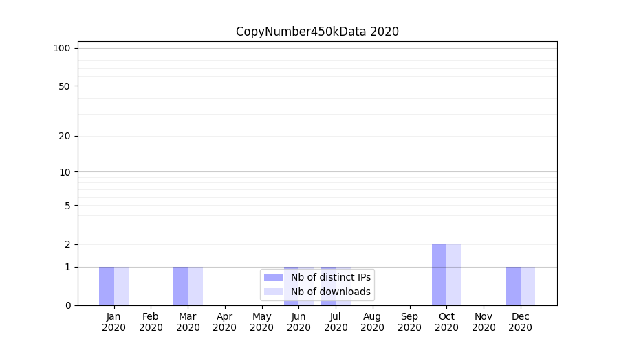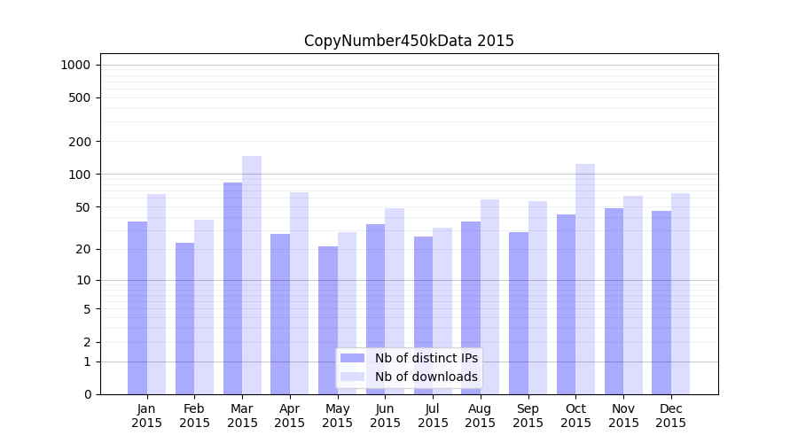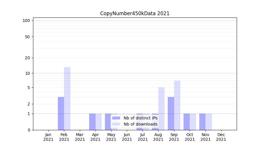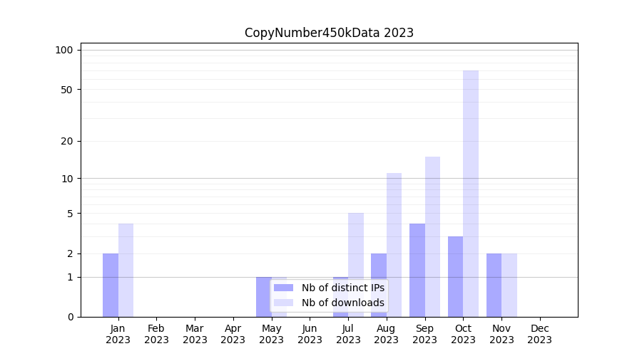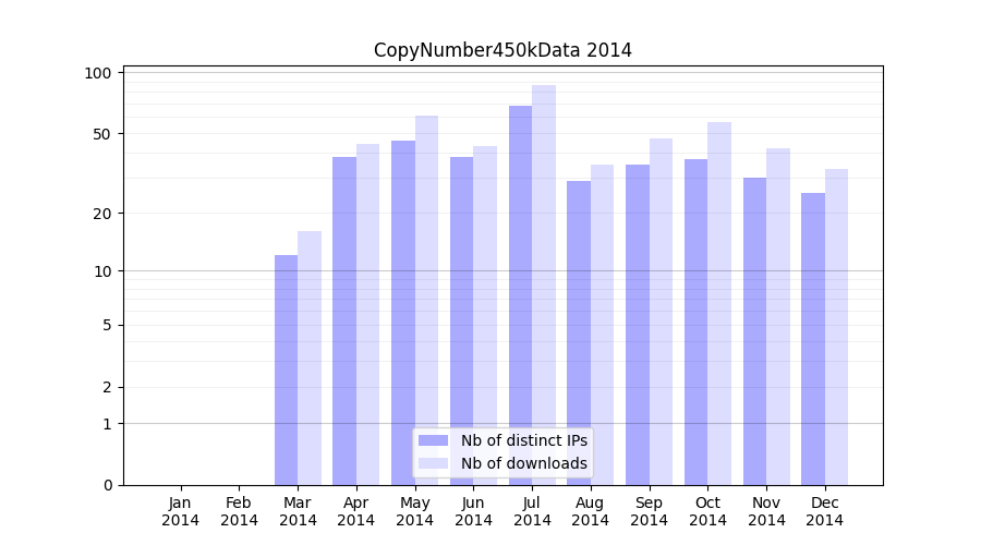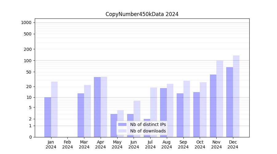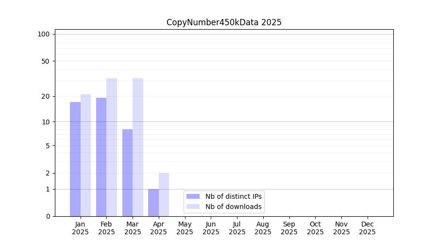 Number of downloads for experiment package CopyNumber450kData, year by year, from 2025 back to 2014 (years with no downloads are omitted):