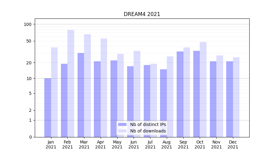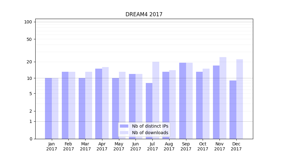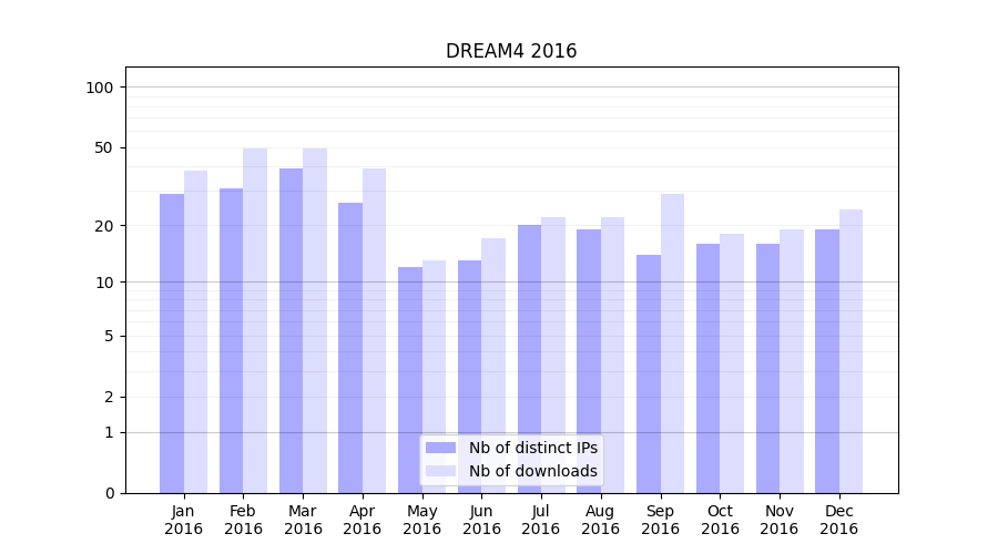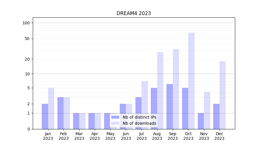 Number of downloads for experiment package DREAM4, year by year, from 2025 back to 2014 (years with no downloads are omitted):