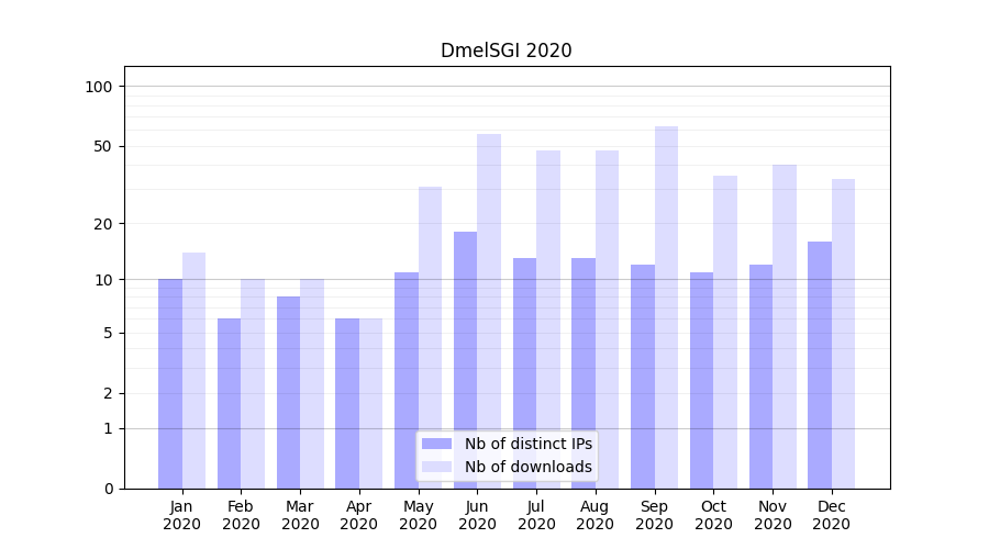 Number of downloads for experiment package DmelSGI, year by year, from 2025 back to 2014 (years with no downloads are omitted):