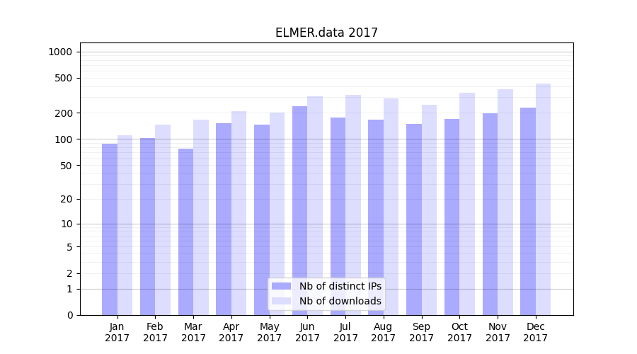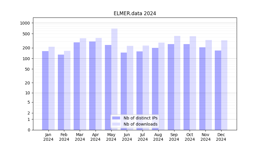 Number of downloads for experiment package ELMER.data, year by year, from 2025 back to 2014 (years with no downloads are omitted):