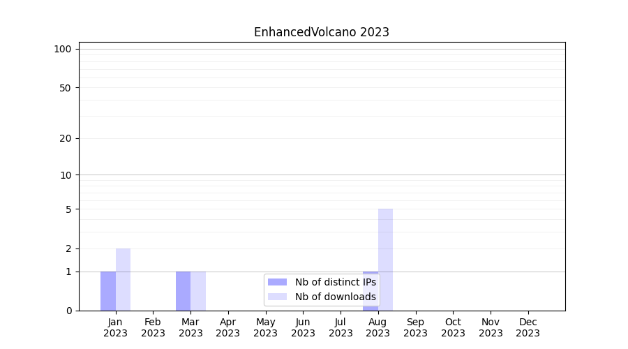 Number of downloads for experiment package EnhancedVolcano, year by year, from 2025 back to 2014 (years with no downloads are omitted):