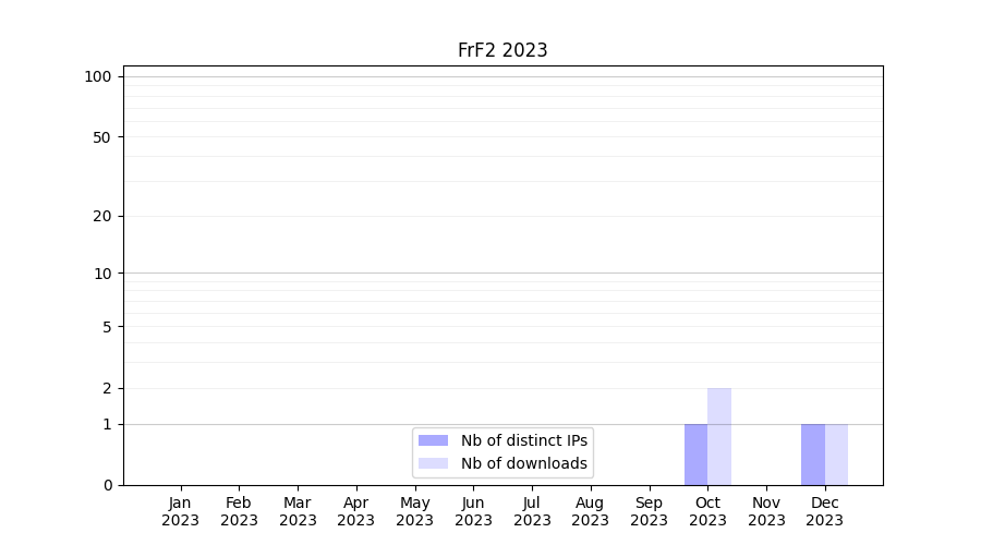 Number of downloads for experiment package FrF2, year by year, from 2025 back to 2014 (years with no downloads are omitted):