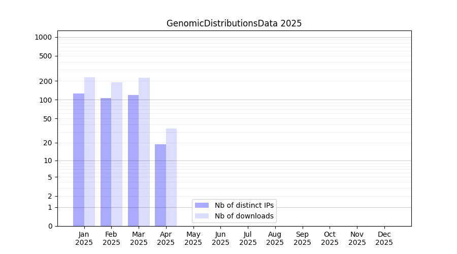 Number of downloads for experiment package GenomicDistributionsData, year by year, from 2025 back to 2014 (years with no downloads are omitted):