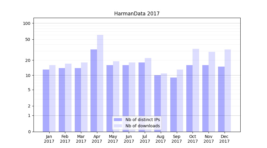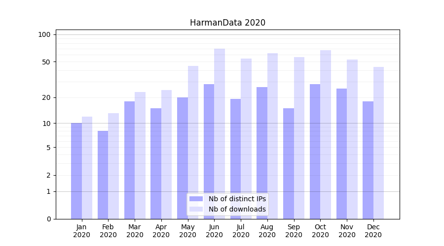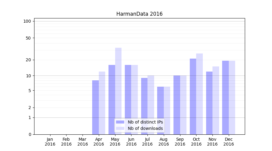 Number of downloads for experiment package HarmanData, year by year, from 2025 back to 2014 (years with no downloads are omitted):