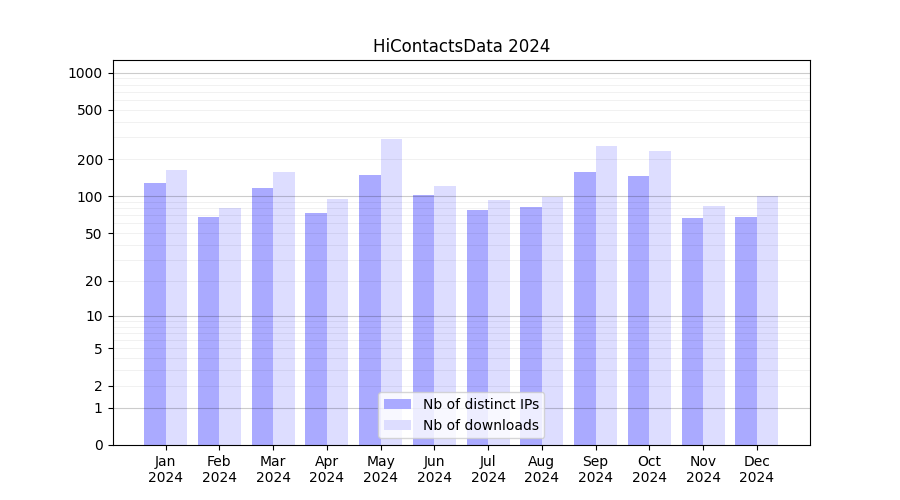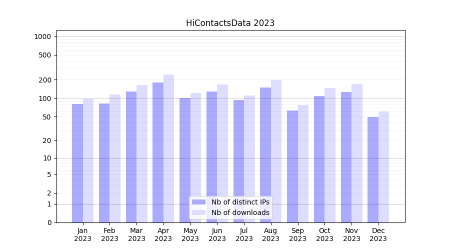 Number of downloads for experiment package HiContactsData, year by year, from 2025 back to 2014 (years with no downloads are omitted):