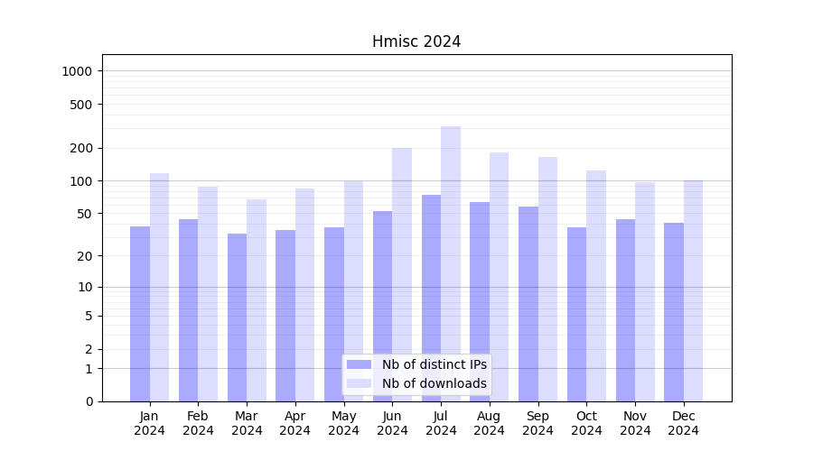 Number of downloads for experiment package Hmisc, year by year, from 2025 back to 2014 (years with no downloads are omitted):