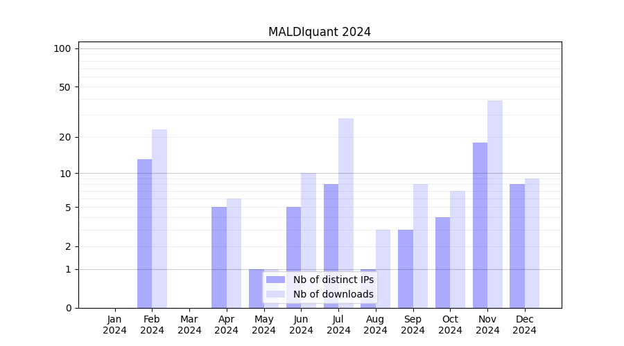 Number of downloads for experiment package MALDIquant, year by year, from 2025 back to 2014 (years with no downloads are omitted):