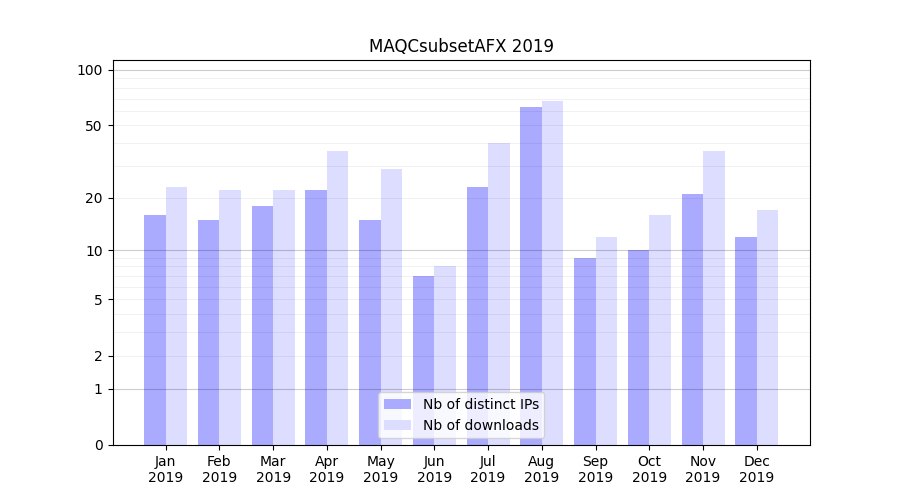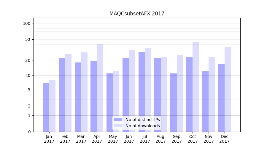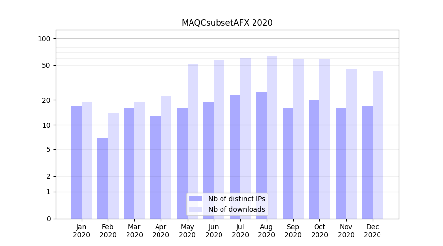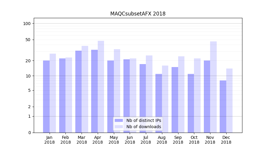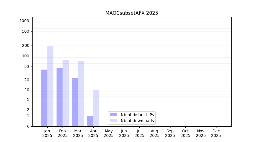 Number of downloads for experiment package MAQCsubsetAFX, year by year, from 2025 back to 2014 (years with no downloads are omitted):