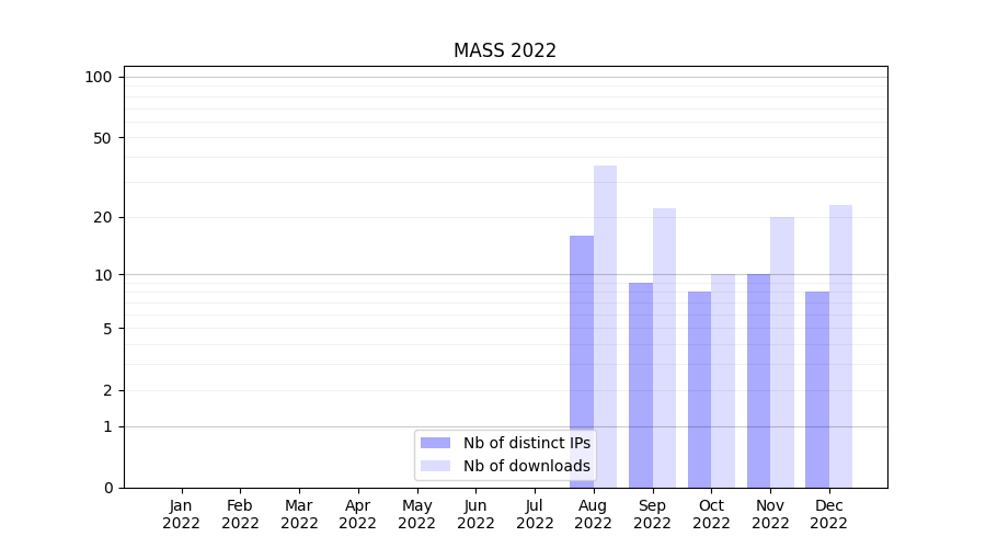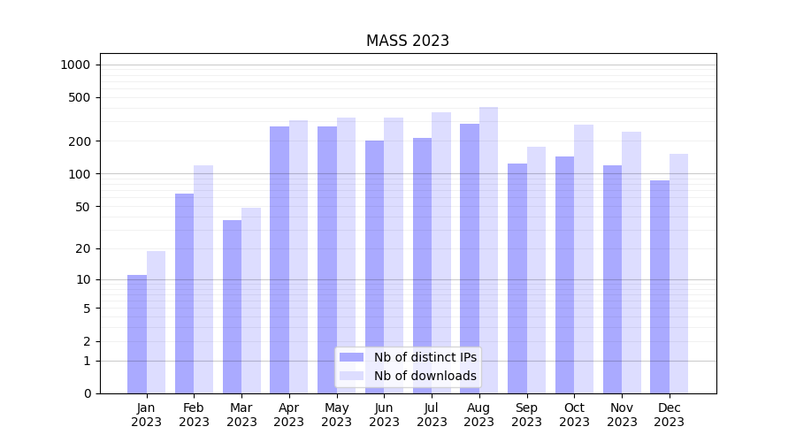 Number of downloads for experiment package MASS, year by year, from 2025 back to 2014 (years with no downloads are omitted):
