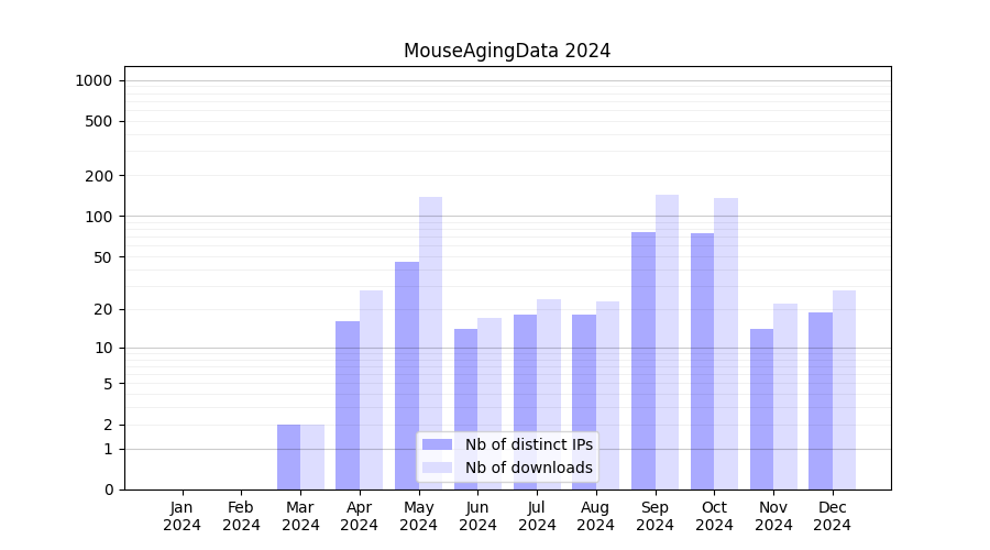 Number of downloads for experiment package MouseAgingData, year by year, from 2025 back to 2014 (years with no downloads are omitted):
