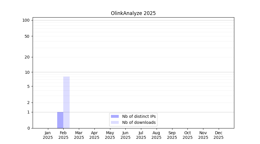 Number of downloads for experiment package OlinkAnalyze, year by year, from 2025 back to 2014 (years with no downloads are omitted):