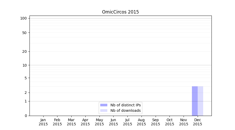 Number of downloads for experiment package OmicCircos, year by year, from 2025 back to 2014 (years with no downloads are omitted):