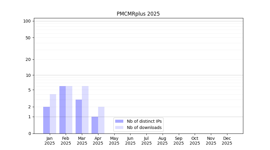 Number of downloads for experiment package PMCMRplus, year by year, from 2025 back to 2014 (years with no downloads are omitted):
