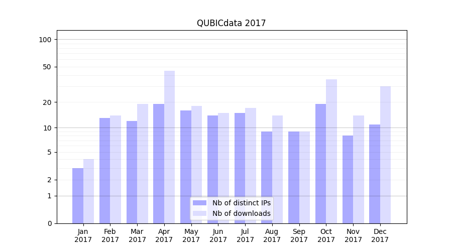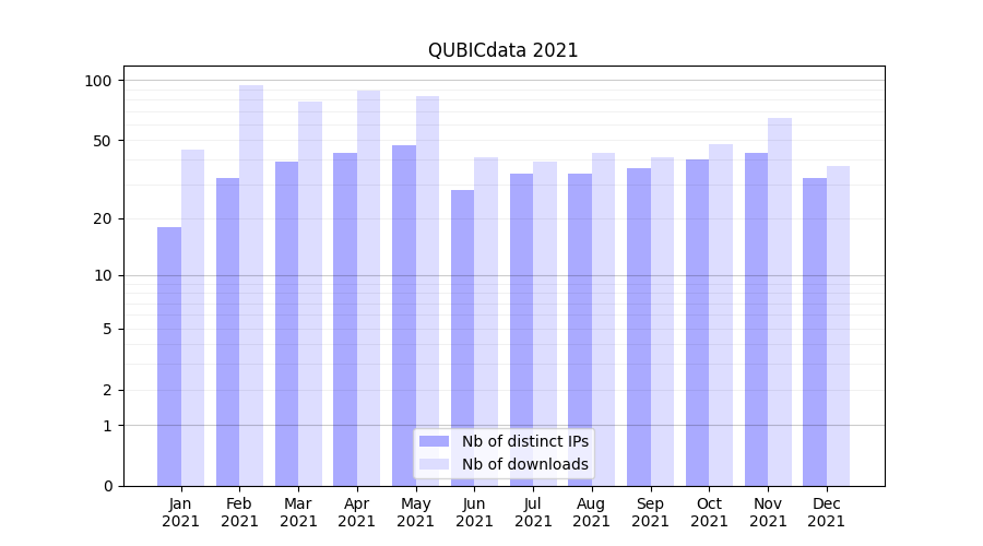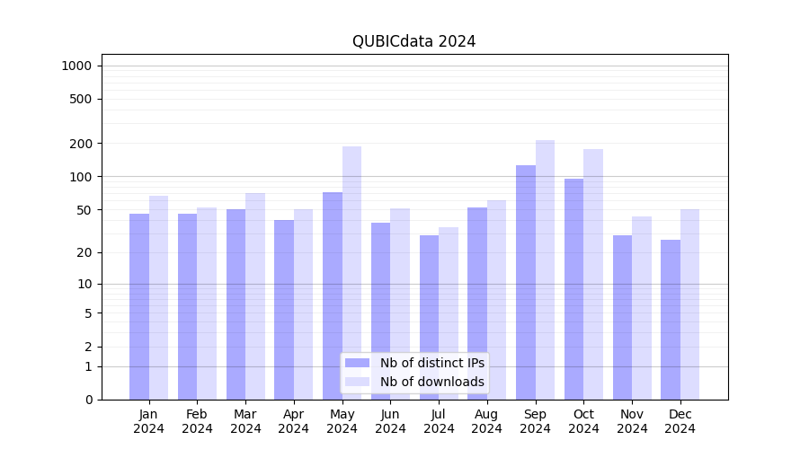 Number of downloads for experiment package QUBICdata, year by year, from 2025 back to 2014 (years with no downloads are omitted):