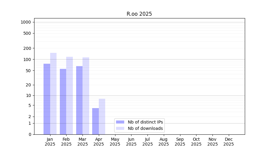 Number of downloads for experiment package R.oo, year by year, from 2025 back to 2014 (years with no downloads are omitted):