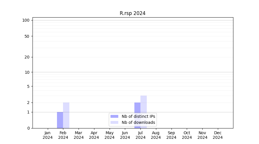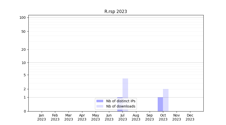 Number of downloads for experiment package R.rsp, year by year, from 2025 back to 2014 (years with no downloads are omitted):