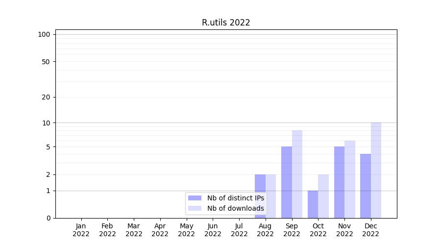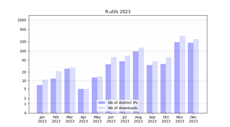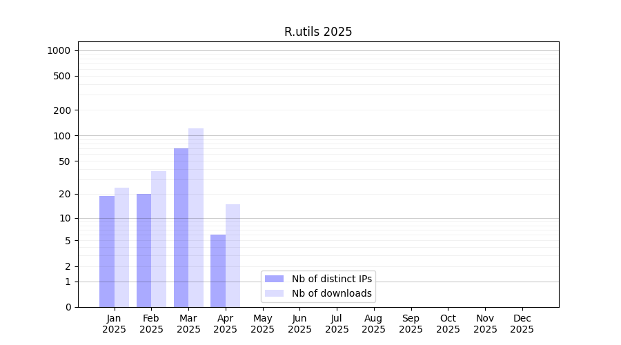 Number of downloads for experiment package R.utils, year by year, from 2025 back to 2014 (years with no downloads are omitted):