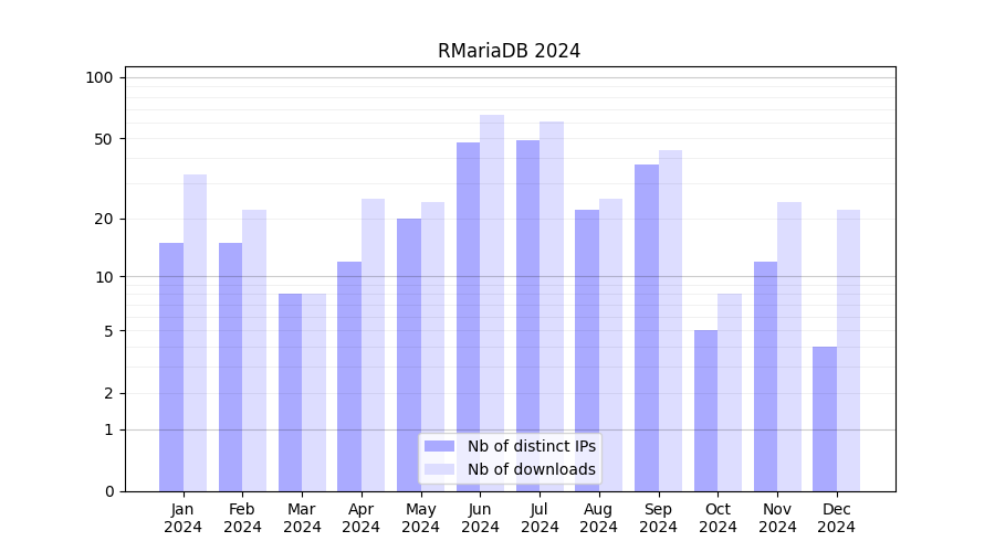 Number of downloads for experiment package RMariaDB, year by year, from 2025 back to 2014 (years with no downloads are omitted):