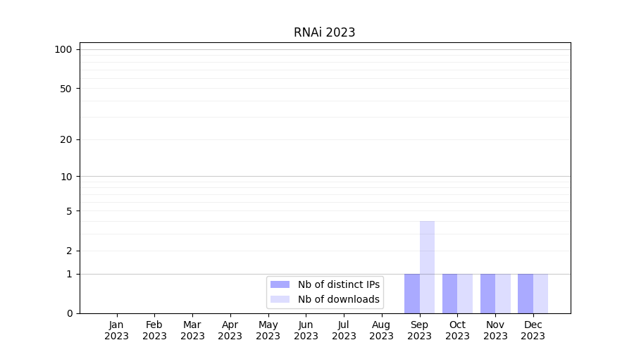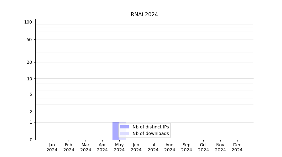 Number of downloads for experiment package RNAi, year by year, from 2025 back to 2014 (years with no downloads are omitted):