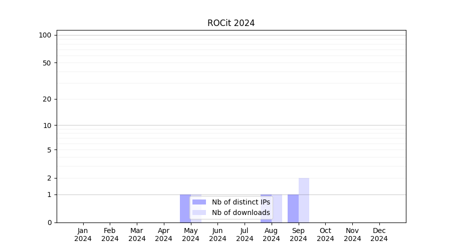 Number of downloads for experiment package ROCit, year by year, from 2025 back to 2014 (years with no downloads are omitted):