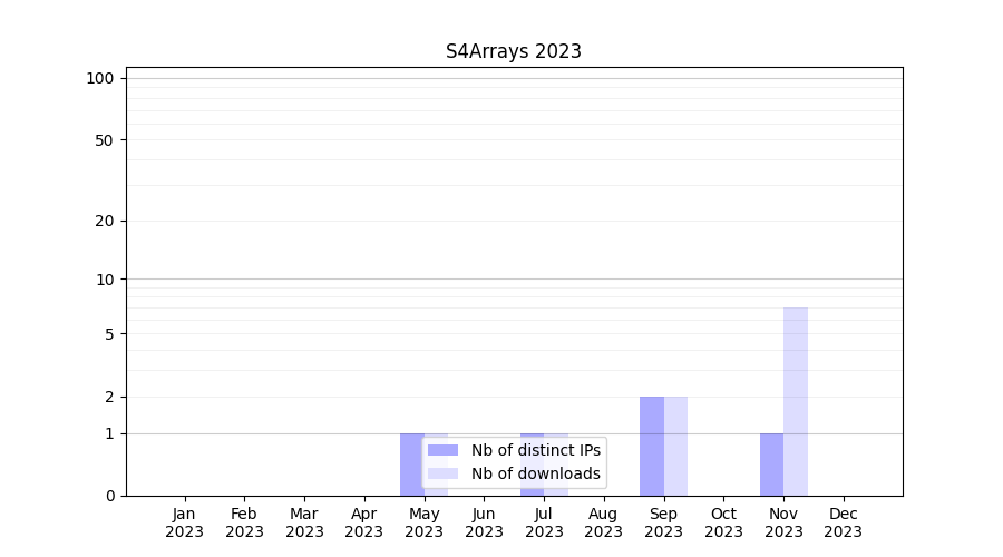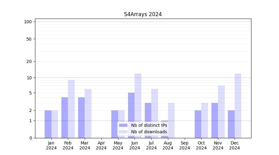 Number of downloads for experiment package S4Arrays, year by year, from 2025 back to 2014 (years with no downloads are omitted):