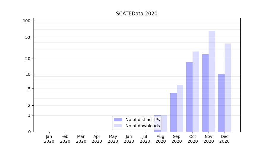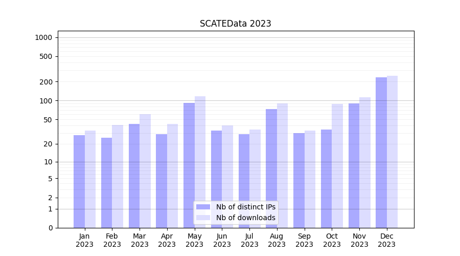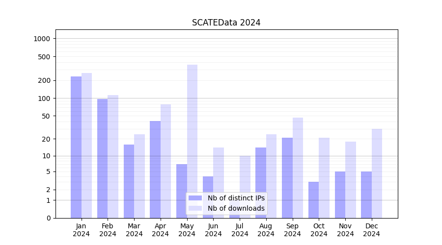 Number of downloads for experiment package SCATEData, year by year, from 2025 back to 2014 (years with no downloads are omitted):