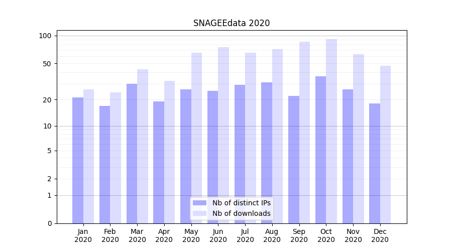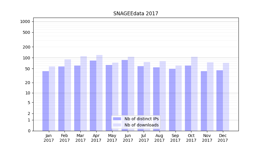 Number of downloads for experiment package SNAGEEdata, year by year, from 2025 back to 2014 (years with no downloads are omitted):