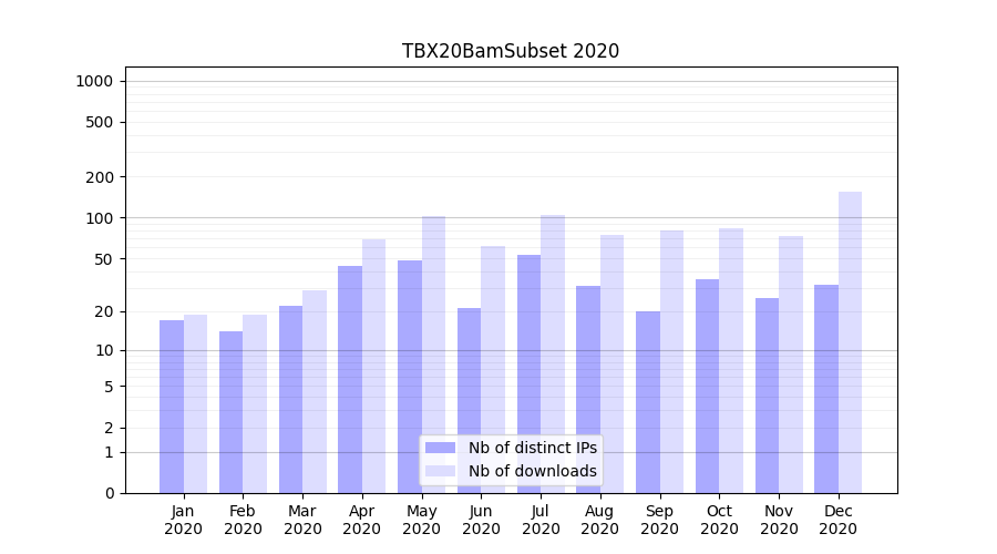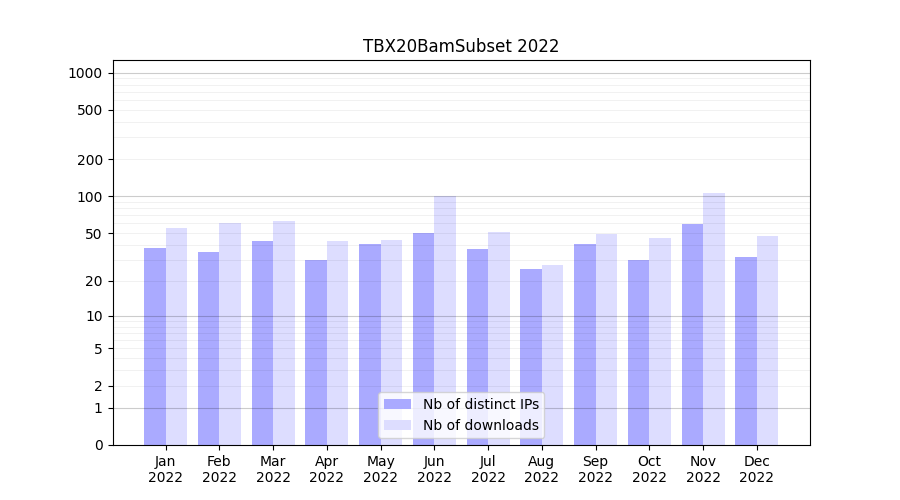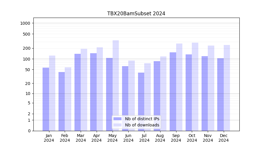 Number of downloads for experiment package TBX20BamSubset, year by year, from 2025 back to 2014 (years with no downloads are omitted):