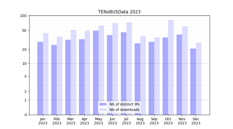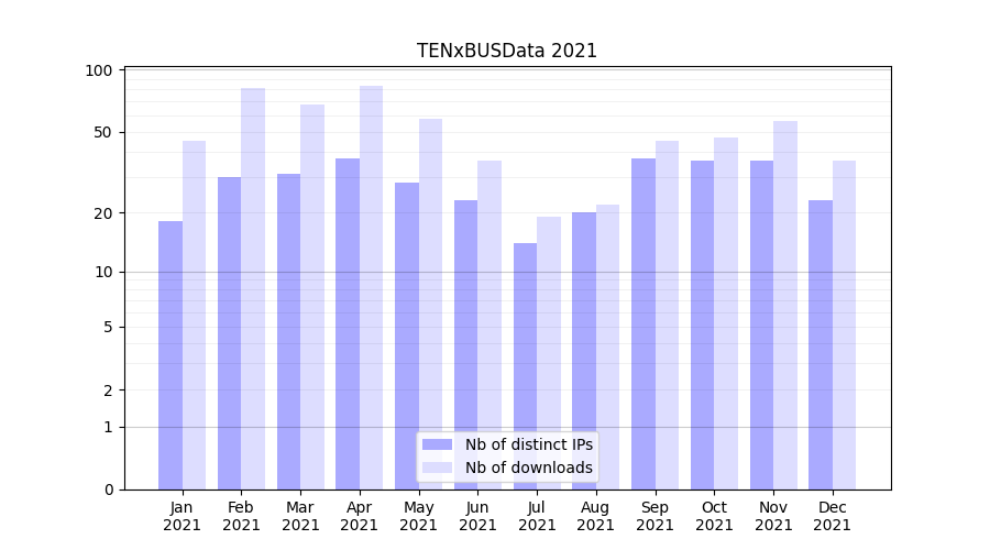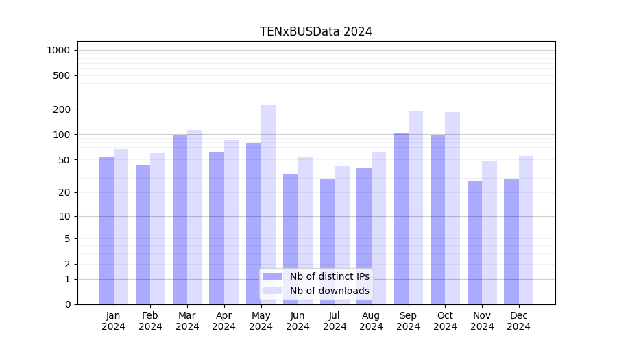 Number of downloads for experiment package TENxBUSData, year by year, from 2025 back to 2014 (years with no downloads are omitted):