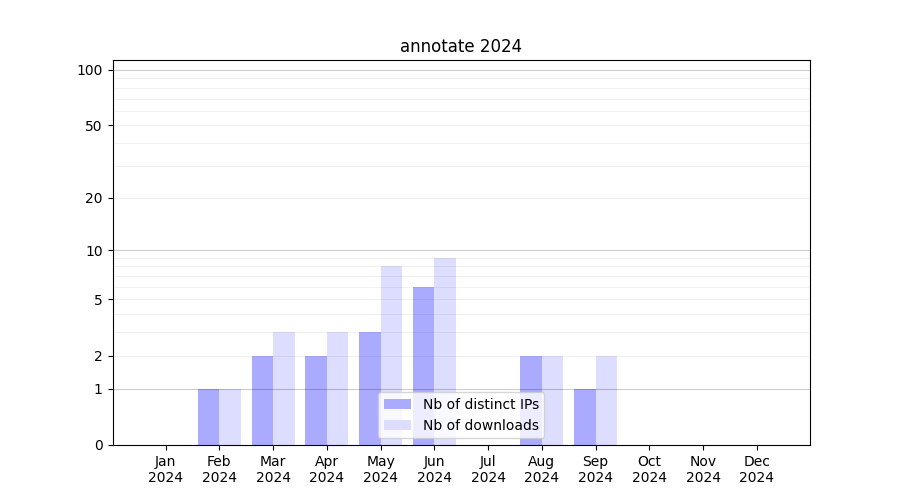 Number of downloads for experiment package annotate, year by year, from 2025 back to 2014 (years with no downloads are omitted):
