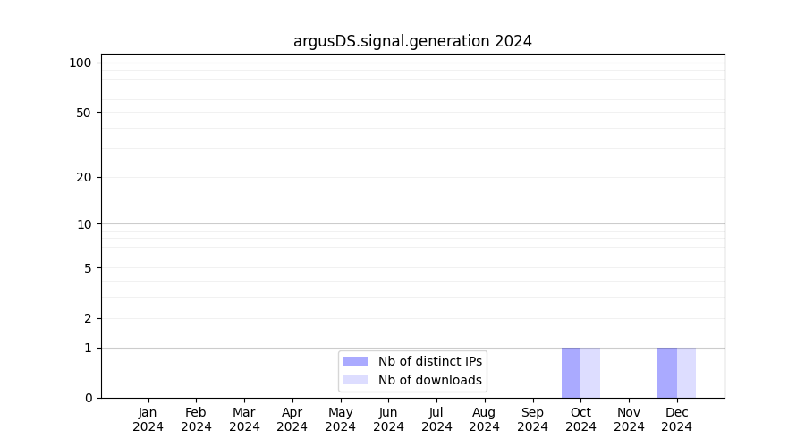 Number of downloads for experiment package argusDS.signal.generation, year by year, from 2025 back to 2014 (years with no downloads are omitted):