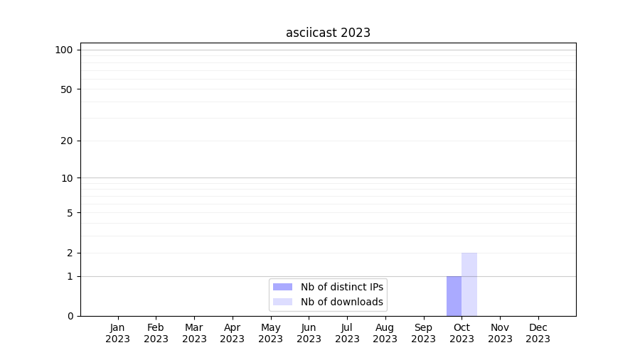 Number of downloads for experiment package asciicast, year by year, from 2025 back to 2014 (years with no downloads are omitted):