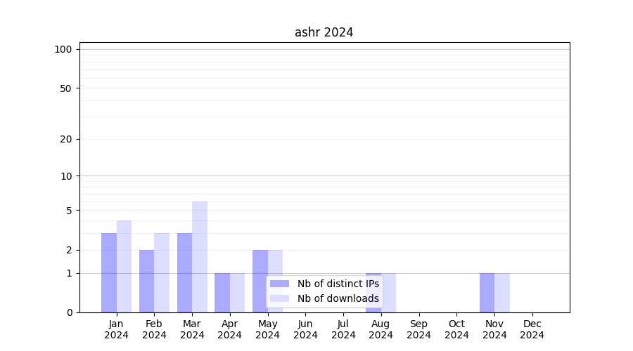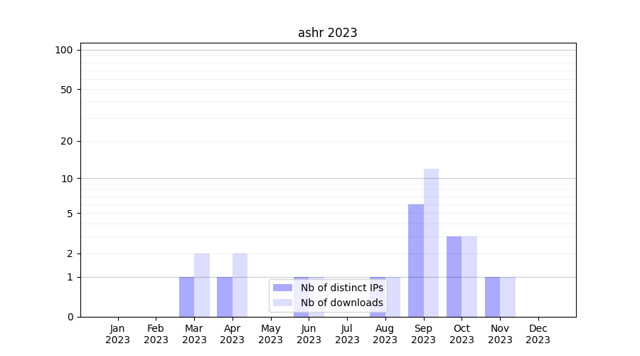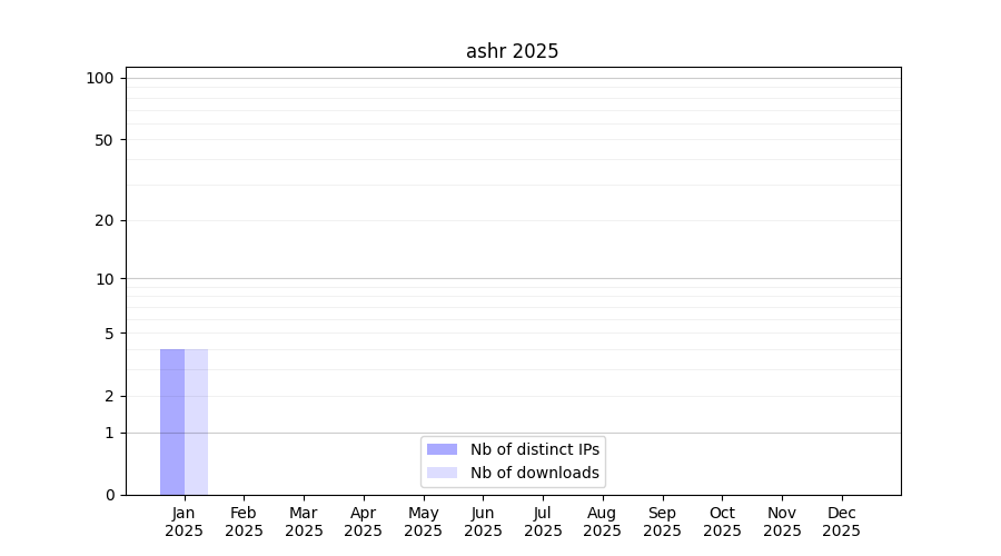 Number of downloads for experiment package ashr, year by year, from 2025 back to 2014 (years with no downloads are omitted):
