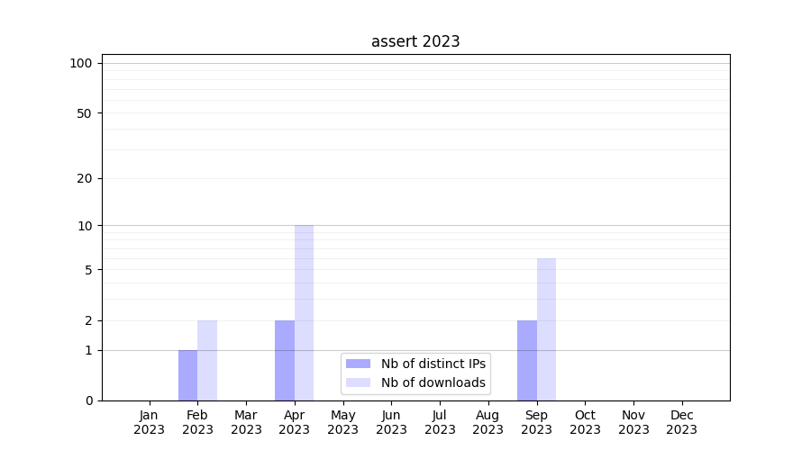 Number of downloads for experiment package assert, year by year, from 2025 back to 2014 (years with no downloads are omitted):