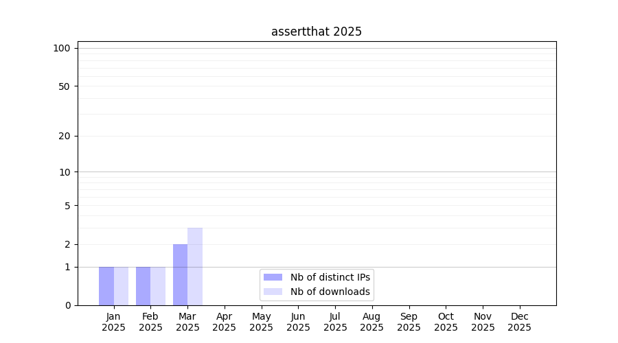 Number of downloads for experiment package assertthat, year by year, from 2025 back to 2014 (years with no downloads are omitted):