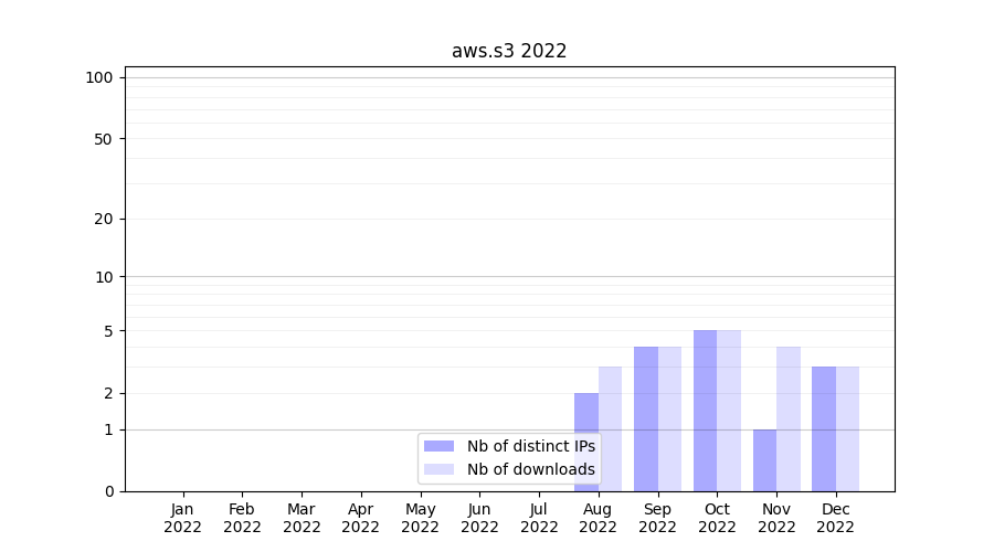 Number of downloads for experiment package aws.s3, year by year, from 2025 back to 2014 (years with no downloads are omitted):