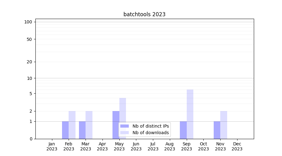 Number of downloads for experiment package batchtools, year by year, from 2025 back to 2014 (years with no downloads are omitted):