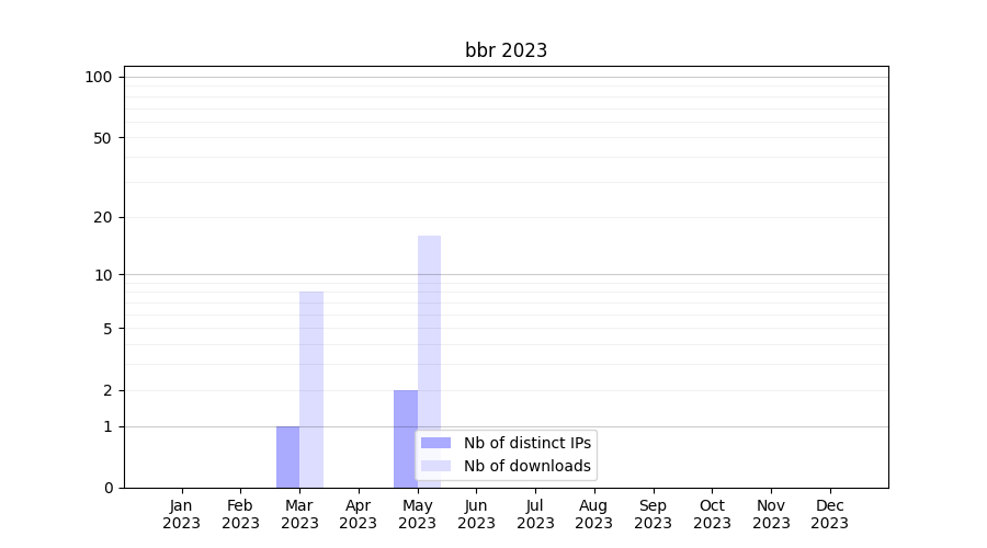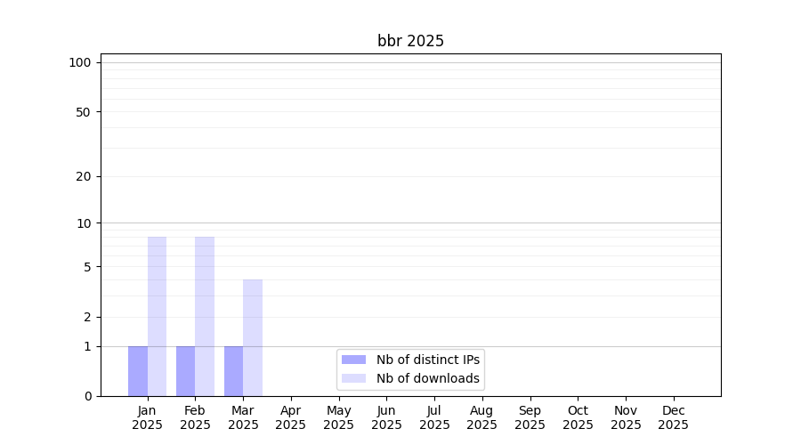 Number of downloads for experiment package bbr, year by year, from 2025 back to 2014 (years with no downloads are omitted):