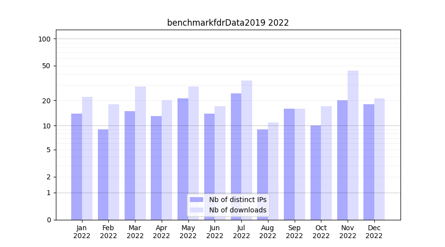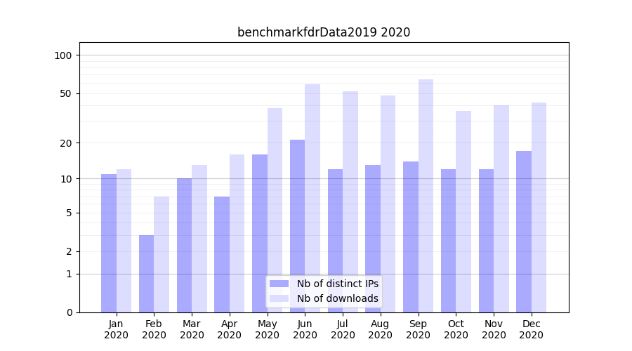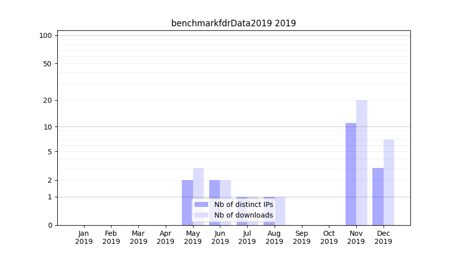 Number of downloads for experiment package benchmarkfdrData2019, year by year, from 2025 back to 2014 (years with no downloads are omitted):