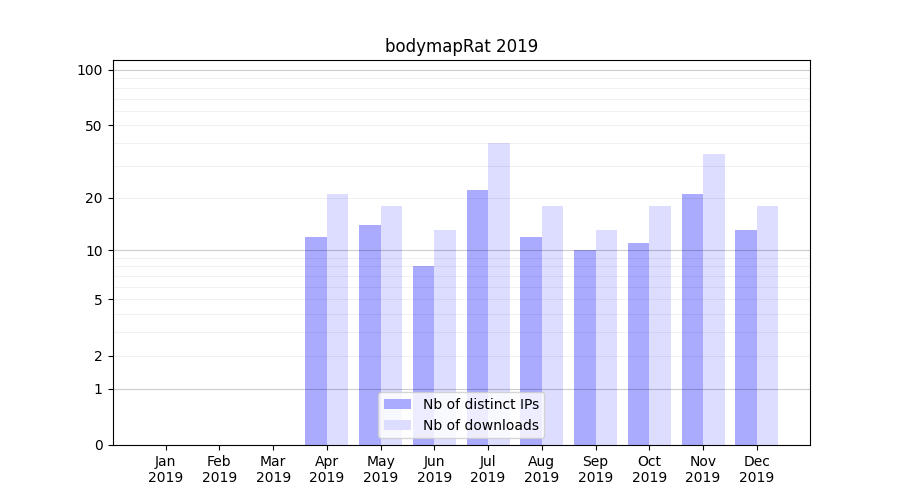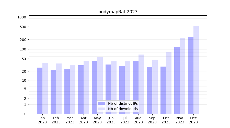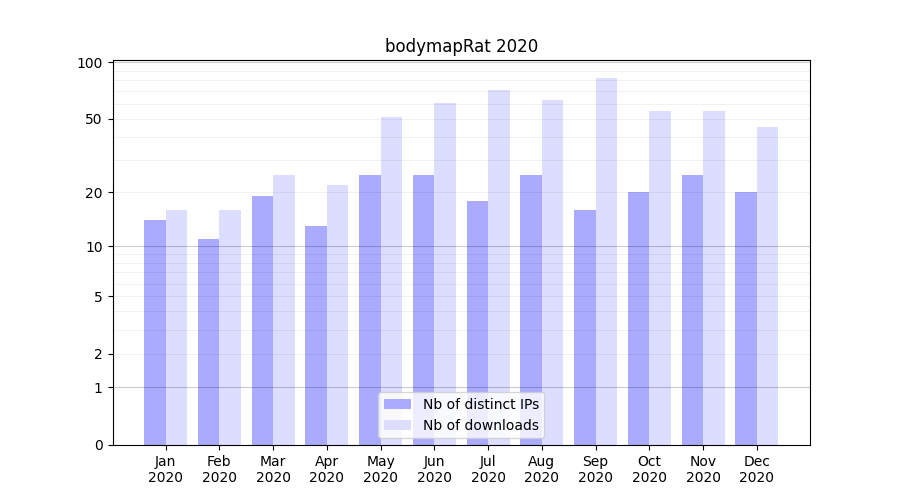 Number of downloads for experiment package bodymapRat, year by year, from 2025 back to 2014 (years with no downloads are omitted):