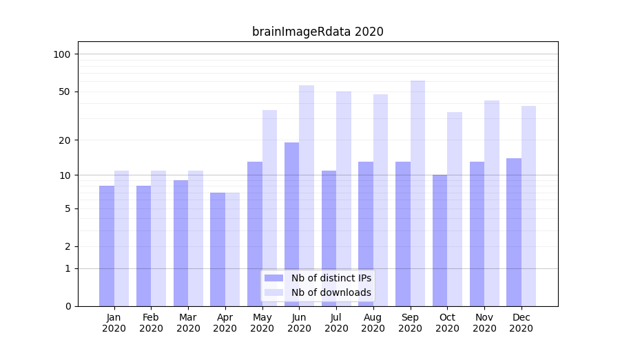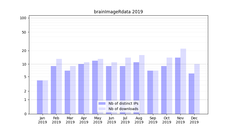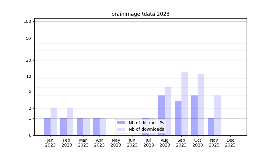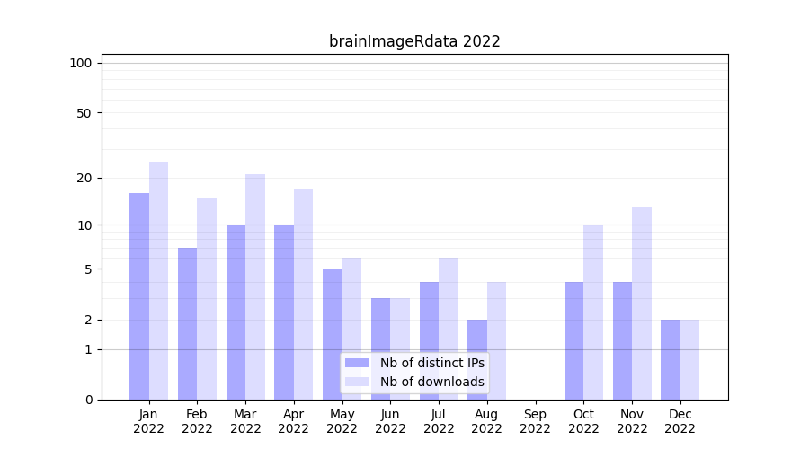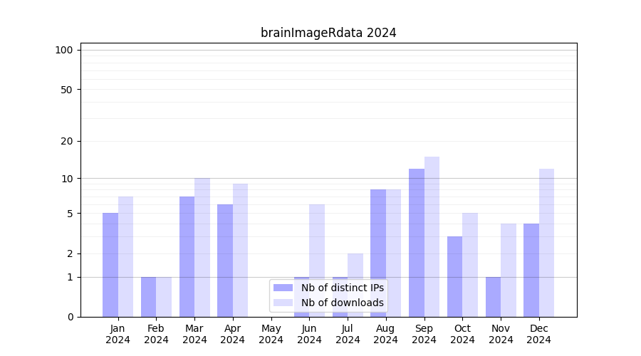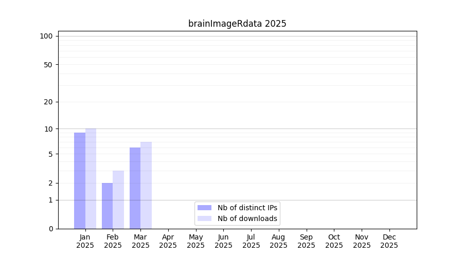 Number of downloads for experiment package brainImageRdata, year by year, from 2025 back to 2014 (years with no downloads are omitted):