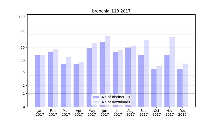 Number of downloads for experiment package bronchialIL13, year by year, from 2025 back to 2014 (years with no downloads are omitted):