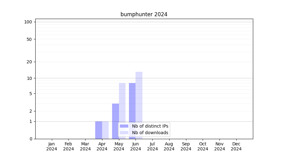 Number of downloads for experiment package bumphunter, year by year, from 2025 back to 2014 (years with no downloads are omitted):