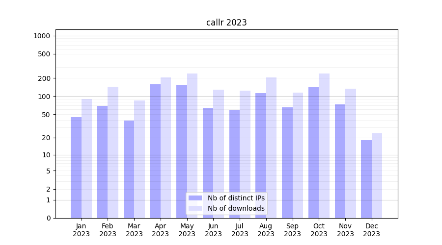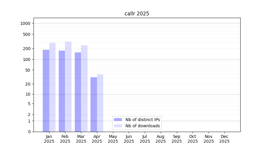 Number of downloads for experiment package callr, year by year, from 2025 back to 2014 (years with no downloads are omitted):
